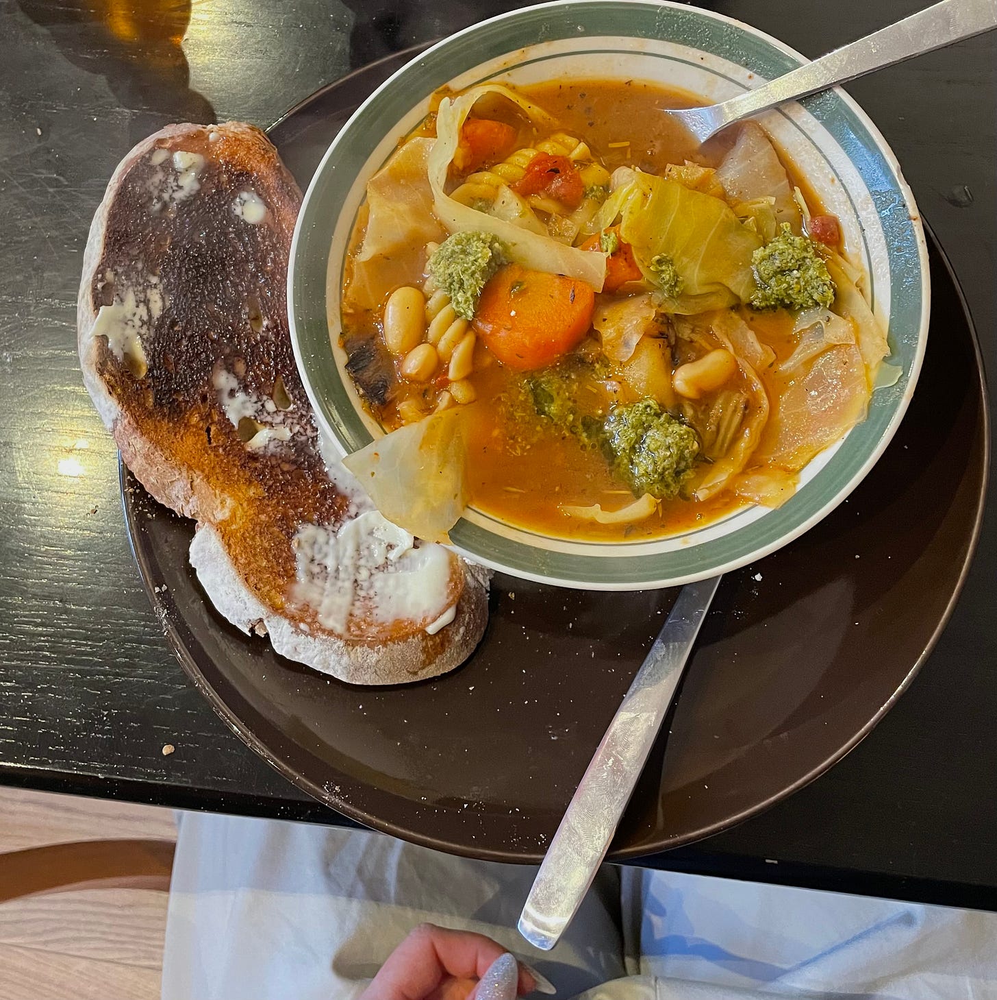 Soothing, life-affirming, possible to make at any given moment using ingredients you already have. Floury bread (toasted until slightly burnt), coated in salted butter. White cabbage fried in good olive oil, two tins of chopped tomatoes, cannellini beans, a handful of fusilli, chicken stock. Vegetable minesweep of the fridge post-Christmas: leftover potatoes, celery, carrots, garlic, leeks, all fried until soft with rosemary, oregano, thyme, black pepper. Topped with dollops of pesto. Sincerely unglamorous, never lets you down.